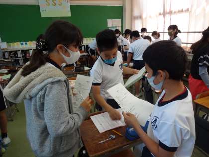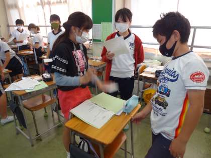 英語で自分の宝物を紹介する学習です。話す役、聞く役、見る役に分かれ取り組みました。
