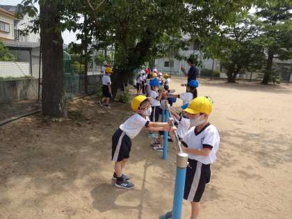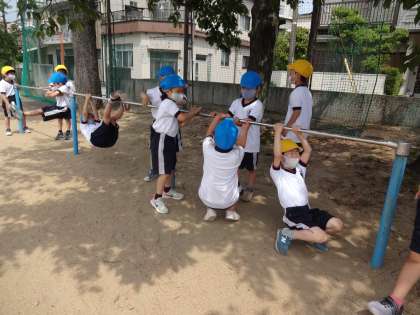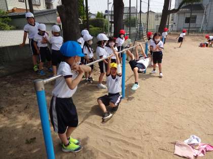 友達と鉄棒を譲り合いながら順番に、鉄棒の技に挑戦しました。
