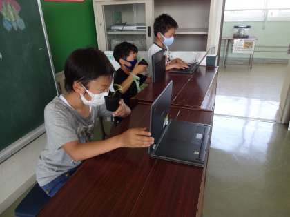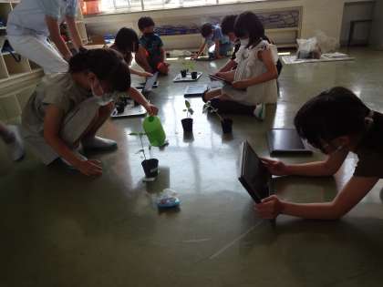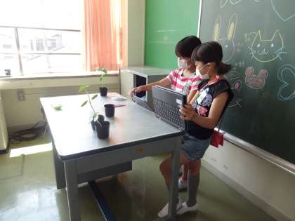 ポットに種をまいた野菜が芽を出し、育ってきました。クロームブックで写真を撮影し、成長の様子を記録しました。以前に撮影した写真と比べられるところが便利です。