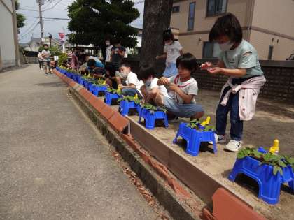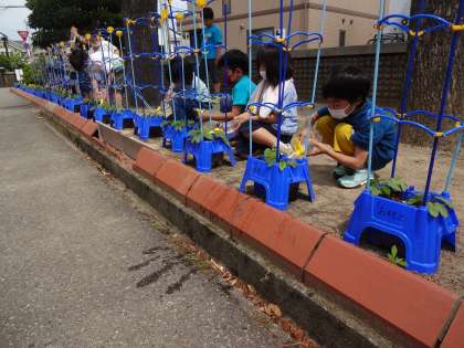 生活科の学習で育てているアサガオが大きくなってきました。今日は、肥料をあげました。