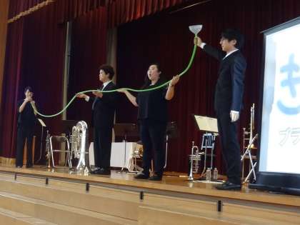 例えば、チューバの管の長さは、5.6mぐらいあると教えていただきました。長さのモデルとして提示された、ホースと漏斗を使って演奏されて、さらに驚きました。