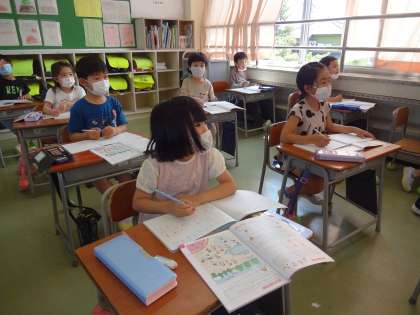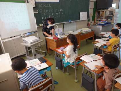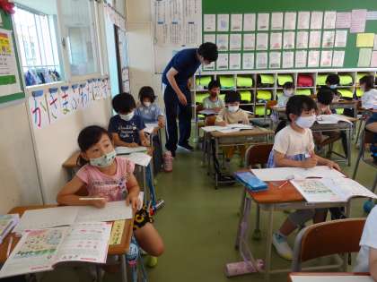ノートのマス目の使い方についても、スクリーンに映し出された先生の手本を見ながら学びました。