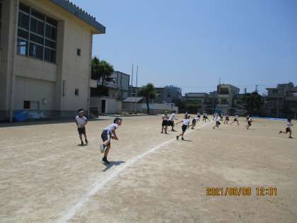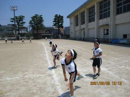 今日は、ソフトボール投げの練習です。遠くまで投げるために、どうしたらよいかを考えました。団に分かれて友達の投げ方を見たり、アドバイスをし合ったりしました。