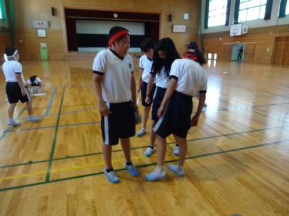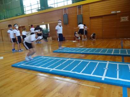 体力テスト種目の「長座体前屈」「立ち幅跳び」「握力」等の測定をしました。