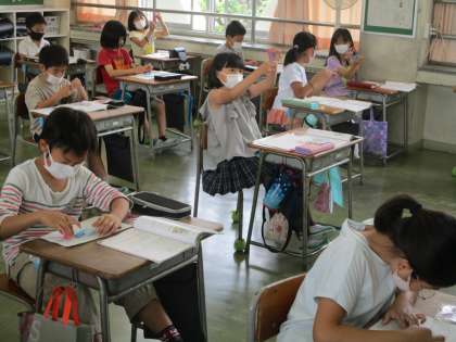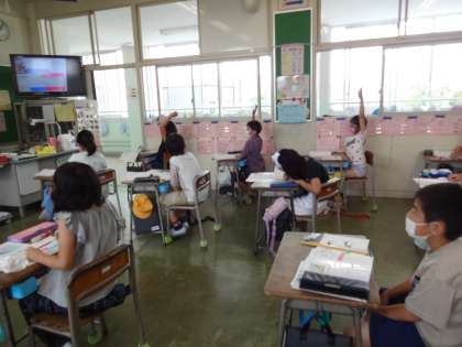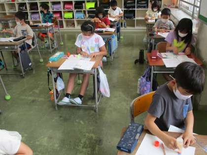 算数科「重なりに注目して 〜図を使って考えよう〜」の学習をしました。昨日の学習の「合わせる」ときのテープ図との違いを見つけ、テープとテープが重なっているところをどのように扱えばよいのかを考えました。