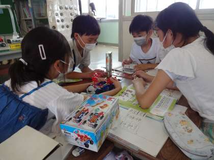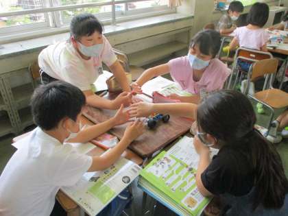 昨日、プロペラカーを作って走らせたときに、乾電池の向きを変えると、走る向きが変わることを発見した子供たち。モーターの回る向きが、乾電池の向きによって変わるのではないかと予想し、確かめました。グループの友達と協力して、上手に実験することができました。