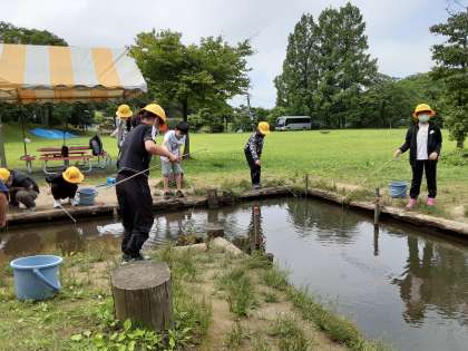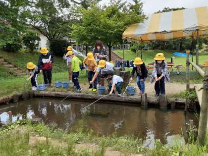 午後の活動、ザリガニ釣りが始まりました。釣り方が分かると、一匹でも多く釣ろうと、目を輝かせて取り組みました。すばらしい集中力です。