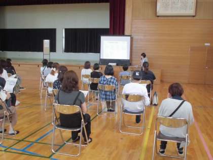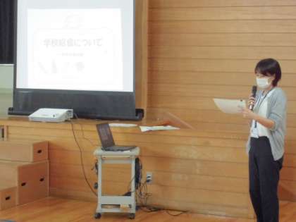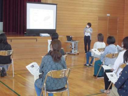 給食参観後に、体育館で木村栄養教諭による講演会を行いました。学校給食の目標や調理の様子等について話をしました。学校給食について理解が深まりました。