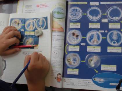 「メダカの成長の様子をまとめよう」を学習課題に学びました。5年生が飼育しているメダカが卵を産み成長していることから、より深い学びにつながりました。