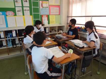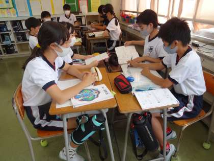 分数のわり算の計算で、答えの間違っている式が提示されました。なぜ間違ったのかを、グループで話し合うグループ学習を行っています。