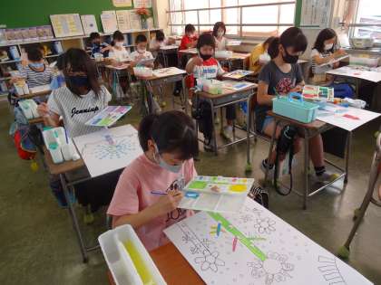 想像した花の感じに合う形や色を見付け、工夫して丁寧に色を塗っています。