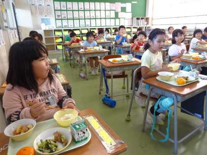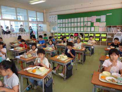 保護者の方に見つめられながら、おいしい給食をいただきました。