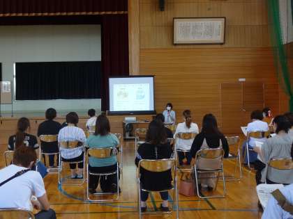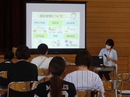 学校給食参観された保護者の方へ、栄養教諭が、学校給食による食育、食事内容、献立の工夫、衛生管理等について話しました。調理の様子の動画も見ていただきました。