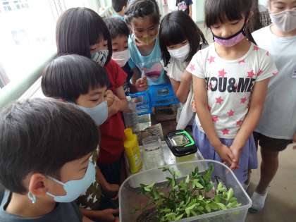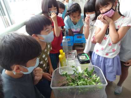 と声をかける子供たち。アゲハが自分の力で虫かごから出られるようにと応援しました。