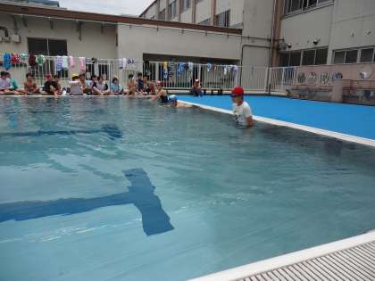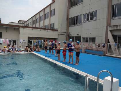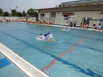 最後に、5・6年生の代表児童が、模範水泳をしました。代表者の名前が呼ばれると歓声が上がり、すばらしい泳ぎを終えると、大きな拍手がわき上がりました。