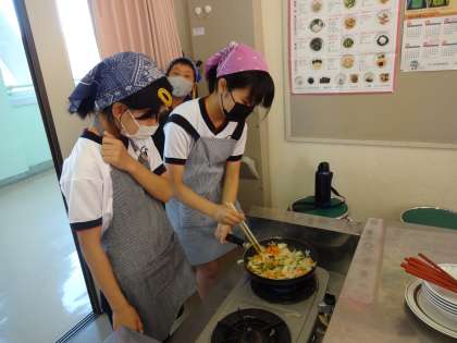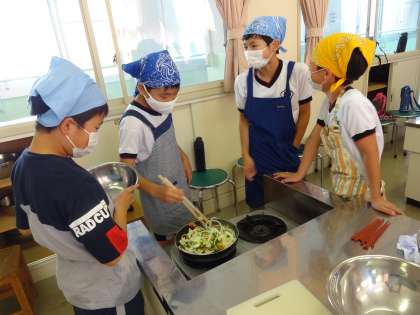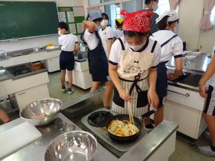 2限になると、1階廊下に炒め物のおいしいにおいが広がりました。次々と出来上がります。きっと、おいしいと思います。ただし、油を入れすぎたという班は、大丈夫だったかな?