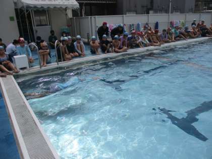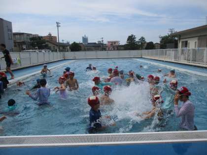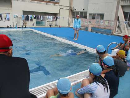 5・6年生合同で水泳学習を行いました。今日は、手を真上に伸ばして背伸びの姿勢を作りけのびをしました。どこまで足を付かずにいけるか確認しながら姿勢を意識して取り組むことができました。最後に5・6年生で一緒に水遊びをしました。