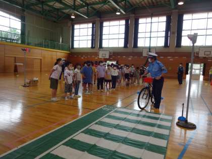 4年生は、自転車交通安全教室の前半は、教室で座学を行い、後半は、体育館で実車による講習を受けました。