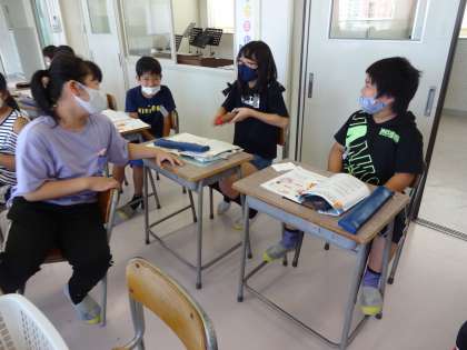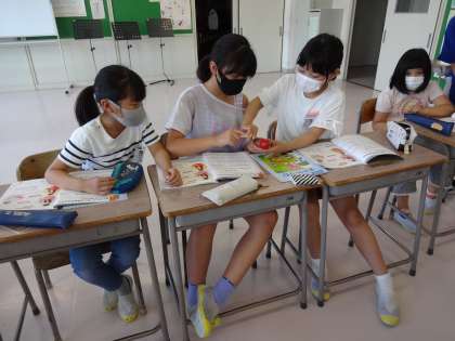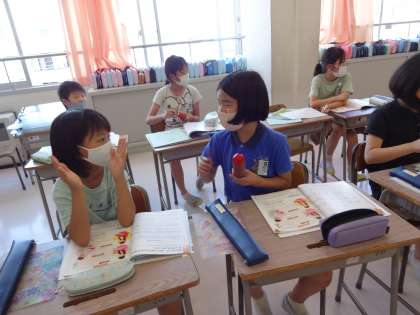音楽科では、拍にのって歌と打楽器を合わせて演奏する学習をしています。