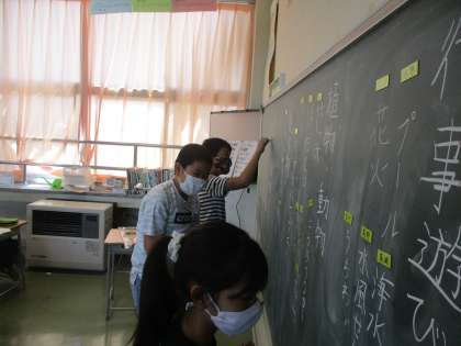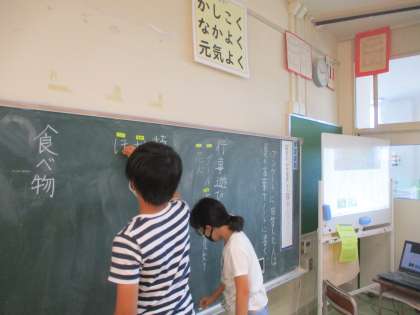 「夏といえば」というテーマで、「行事」「食べ物」「動物」「天気」について、思いついた言葉をノートに書きました。その後に、各列で思いついた言葉を書き、どこの列が一番多く書くことができるか競い合いました。友達が書いた言葉を見て考えをシェアすることができました。