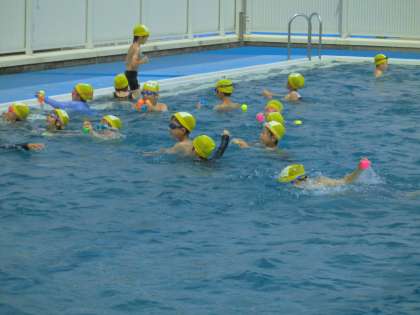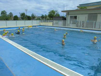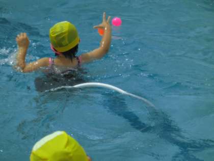 プールに入りました。ピンポン球やボールをつかまえたり、水中用のフラフープをくぐったりしました。気温も上がってきたので、とても楽しい時間になりました。
