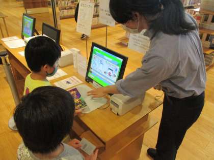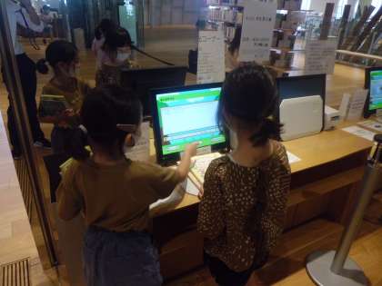 子供たちは、初めて機械を使って本を借りられたことに喜びました。また、機械に差し込まれた後の「貸し出しカード」が熱くなっていることに驚きました。