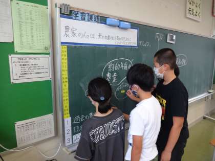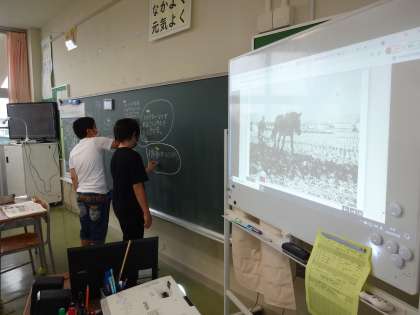 約60年前の農業と、現在の農業を比べられるように、子供たちが黒板に記入しました。意見を交流しながら知識を深めました。