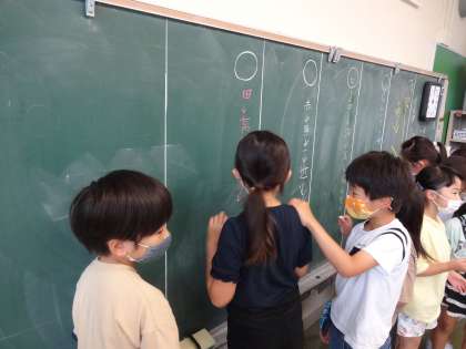 漢字しりとりをしています。班ごとに、1・2年生で習った漢字を使って、しりとりをいくつつなげられるか競っています。