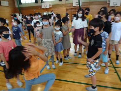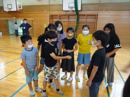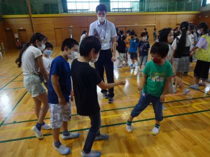 音楽に合わせて体育館を移動し、音楽が止まったら、目の前の人と「じゃんけん、ぽん。」