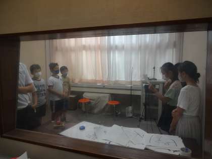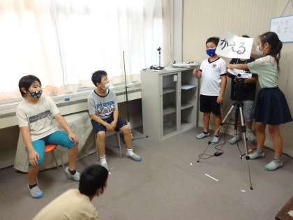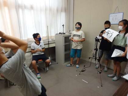 放送室で繰り広げられる「ジェスチャーゲーム」の様子を、各教室に向けてテレビ放送しました。