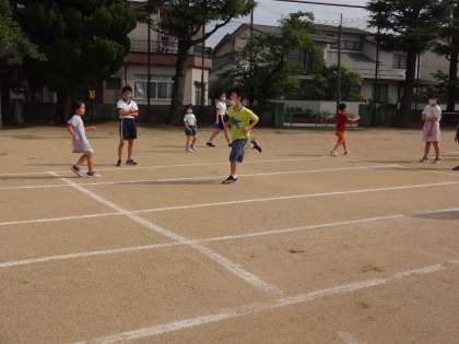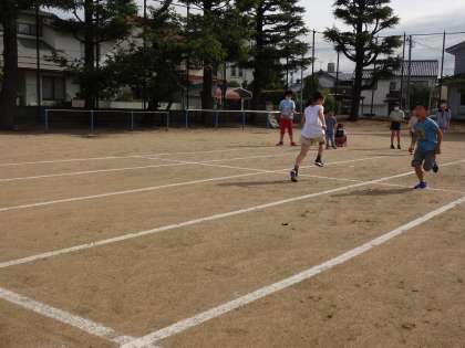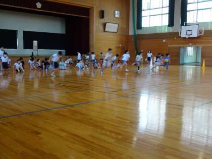 1枚目の写真は、いろいろ姿勢スタートコースです。「体育座りの姿勢から」「寝そべった姿勢から」など、スタートの仕方を指示します。いろいろなスタート姿勢から競走します。