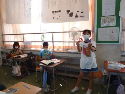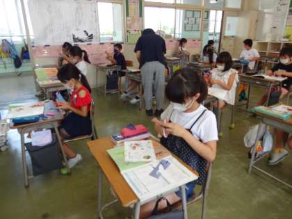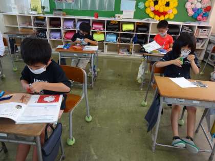 図画工作科の学習のように見えますが、理科です。教科書の付録(昆虫のからだのつくり)で、昆虫の切り紙を作りました。二つ折りにして、昆虫のシルエットどおりに丁寧に切りました。とても集中して取り組みました。
