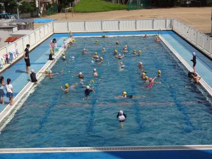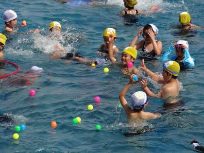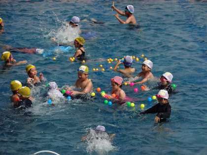 1・2年生は合同で、1限にプールへ入りました。先生が、水に浮くボールや、沈むボールをプールへ投げ込みました。先生の号令で、子供たちは、勢いよくボールを取りに行きました。楽しく学習できました。