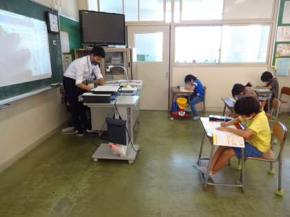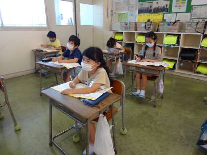 配付する本物のはがきに書く前に、ワークシートを活用し、暑中見舞いの書き方を学びました。表書きについては、スクリーンに映し出された先生の手本どおりに書きました。