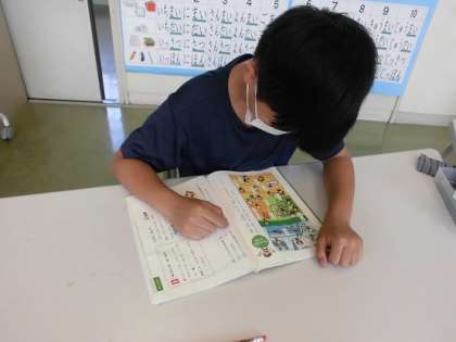 教科書の挿絵を見ながら、片仮名を使った文をつくりました。絵の中にある片仮名を進んで探すことができました。