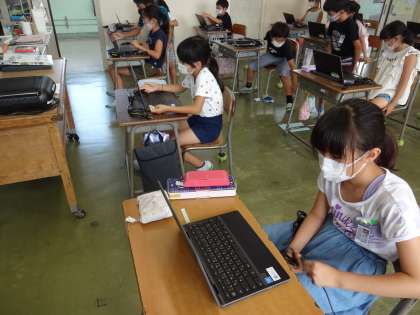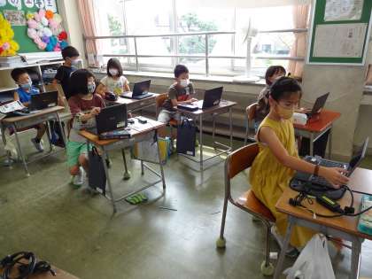 夏休みにクロームブックを活用した課題を出しています。夏休みに入る前に、もう一度クロームブックを開いて、操作方法を確認しました。