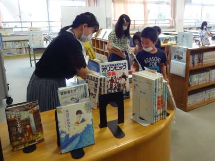 今日は、午前のみの図書室の開放です。小雨が降っていましたが、図書室を利用するために登校する子供がいて嬉しいです。外出するといつもより涼しく感じたと言っていた子供がいました。