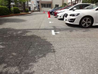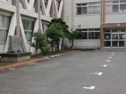 昨日、前庭の来客用、職員用の駐車スペースに、用務員が駐車目印を描きました。