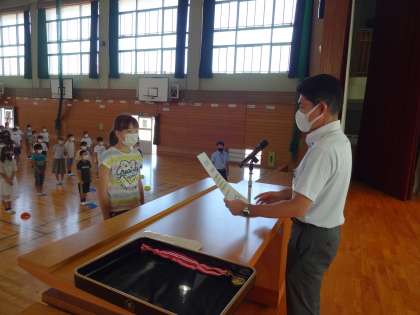 また、始業式後には、受賞報告をしました。県体3部の水泳競技で優勝した6年生の表彰をお祝いしました。