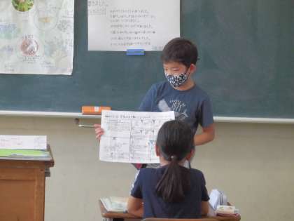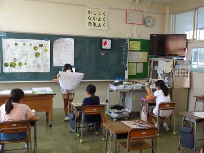 夏休み中に取り組んだ自由研究の紹介をしています。みんな、興味津々の顔つきで友達の説明を聞いています。気になることがあると、すぐに質問もしました。