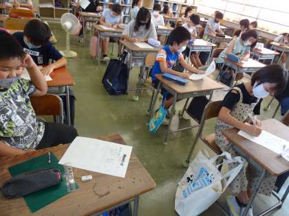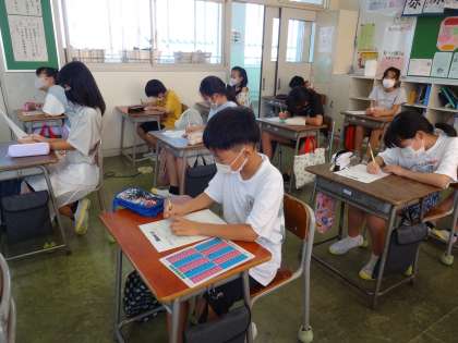 夏休みビンゴゲームをしました。ビンゴカードに、夏休みの心に残った思い出を9つ記入してから始めました。