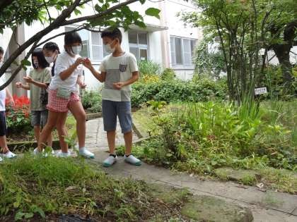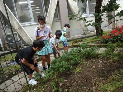 花壇の整備で中庭に出てきた3年生。自然大好きな子供たちは、すぐに思い思いの行動を始めます。