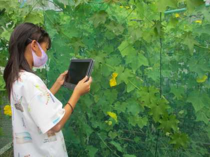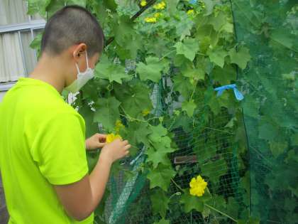 ヘチマやアサガオ等の花の花粉をセロハンテープを使って採取しました。花のつくりを観察しながら違いを見付けて、さらに教室に戻って顕微鏡を活用して観察しました。