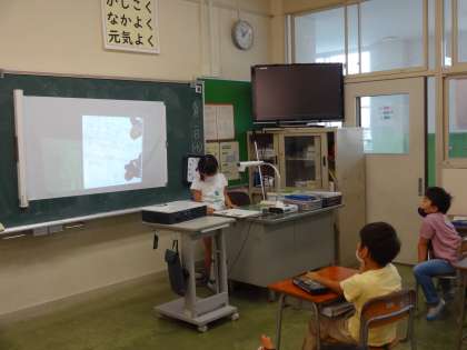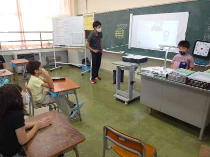 写真は、いろいろなパイを作ったこと、かまどたんじろうの羽織の模様について調べたことを発表している様子です。