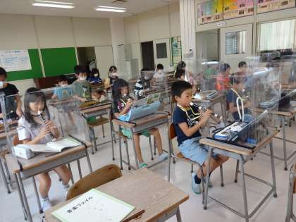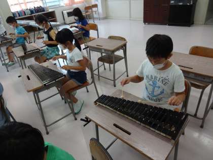 「ゆかいな木きん」の曲を、鍵盤ハーモニカ、リコーダー、木琴の3つのパートに分かれて演奏しました。