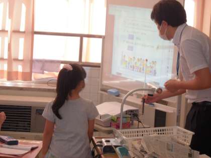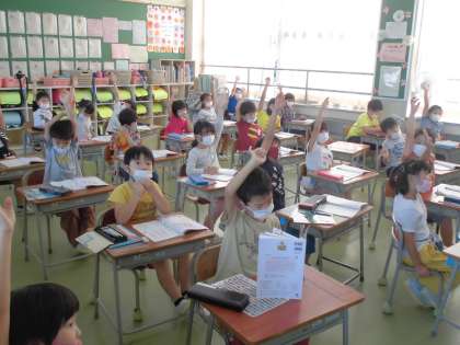 教科書に載っている、バス停に並んでいる人の絵を見て、何人並んでいるのか、ゆかさんは前から何番目かなどをみんなで考えました。数字を書いたり工夫している子供もいます。みんな自分を指名してほしくて手を挙げています。