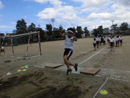 走り幅跳びの練習を始め、記録を伸ばそうと頑張っている子供たち。