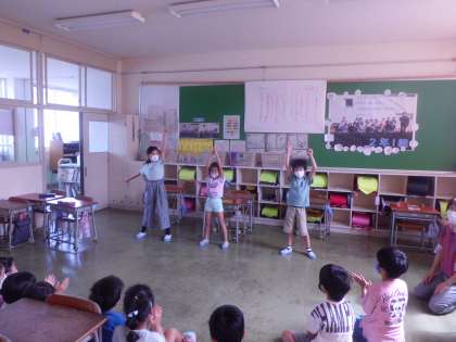 フォーメンションを変えたり、決めポーズを考えたり、楽しそうに練習の成果を披露しました。子供からは「もっと笑って」「かっこいい」など、黄色い声援が飛び交う、とても楽しい時間になりました。