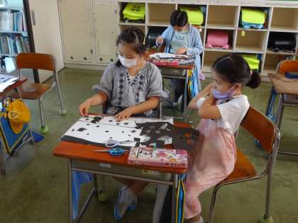 切った形を見ながら、表したいことを考えました。紙はシールになっているので、黒色の画用紙に貼っていきました。