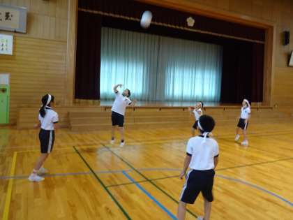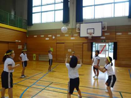 教室でルールを確認し、体育館でオーバーハンドパスやアンダーハンドパスの練習をしました。